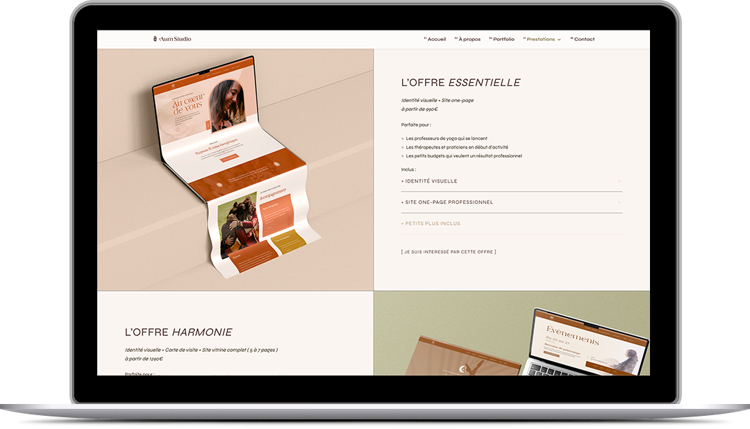 Aum Studio accompagne les praticiens du bien-être, thérapeutes et marques conscientes dans la création d’identité authentique, de support harmonieux et de site intuitif. Chaque projet est une expérience unique, guidée par la bienveillance et la recherche d’équilibre entre beauté et efficacité.